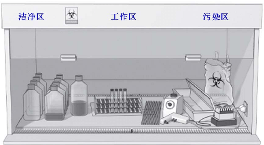 生物安全柜的工作區(qū)應(yīng)該從左往右或者從右到左被依次劃分為三個區(qū)域:清潔區(qū)、操作區(qū)和污染區(qū)。而實(shí)驗(yàn)供給品應(yīng)放置在潔凈區(qū)內(nèi);實(shí)驗(yàn)儀器和樣品應(yīng)放置在操作區(qū)域;廢棄物應(yīng)放置在污染區(qū)內(nèi)。