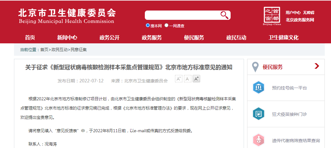 日前,據北京市市場監督管理局網站消息,北京市衛生健康委員會組織制定的《新型冠狀病毒核酸檢測樣本采集點管理規范》,說明了新型冠狀病毒核酸檢測樣本采集點的基本要求、采集點設置、設施設備及物品、人員要求、樣本采集、樣本保存及運輸、醫療廢棄物處理、環境消殺等多方面做出要求,指導北京的核酸采樣管理。