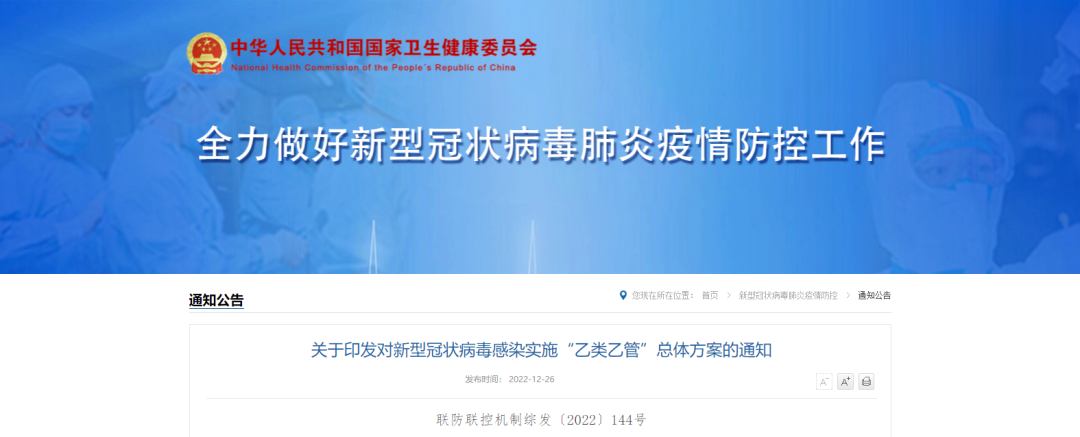 12月26日,國務院應對新型冠狀病毒感染疫情聯防聯控機制綜合組印發《關于對新型冠狀病毒感染實施“乙類乙管”的總體方案》。