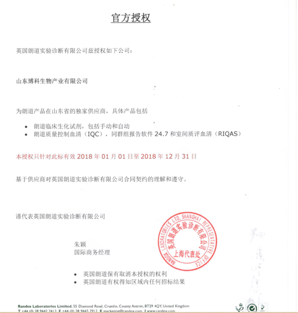 2017年度,博科生物與RANDOX 朗道的合作,取得了非常好的成績(jī)。2017年是朗道在中國(guó)區(qū)改革的第一年,在此過(guò)程中憑借朗道優(yōu)質(zhì)的產(chǎn)品質(zhì)量和博科生物優(yōu)秀的業(yè)務(wù)及售后團(tuán)隊(duì),博科生物緊跟國(guó)內(nèi)形勢(shì),順利完成2017年年度銷售額任務(wù)。基于雙方良好的合作基礎(chǔ)和銷售成績(jī),英國(guó)RANDOX公司將在2018年度延續(xù)與博科生物的合作關(guān)系。