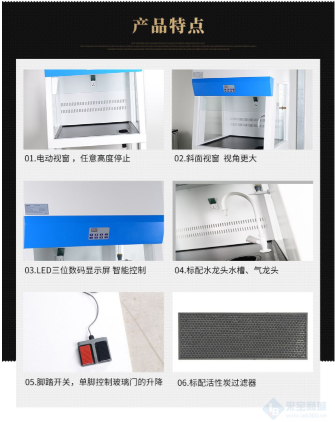 * 11、通風柜配置腳踏開關,單腳控制玻璃門的升降,更加實用。